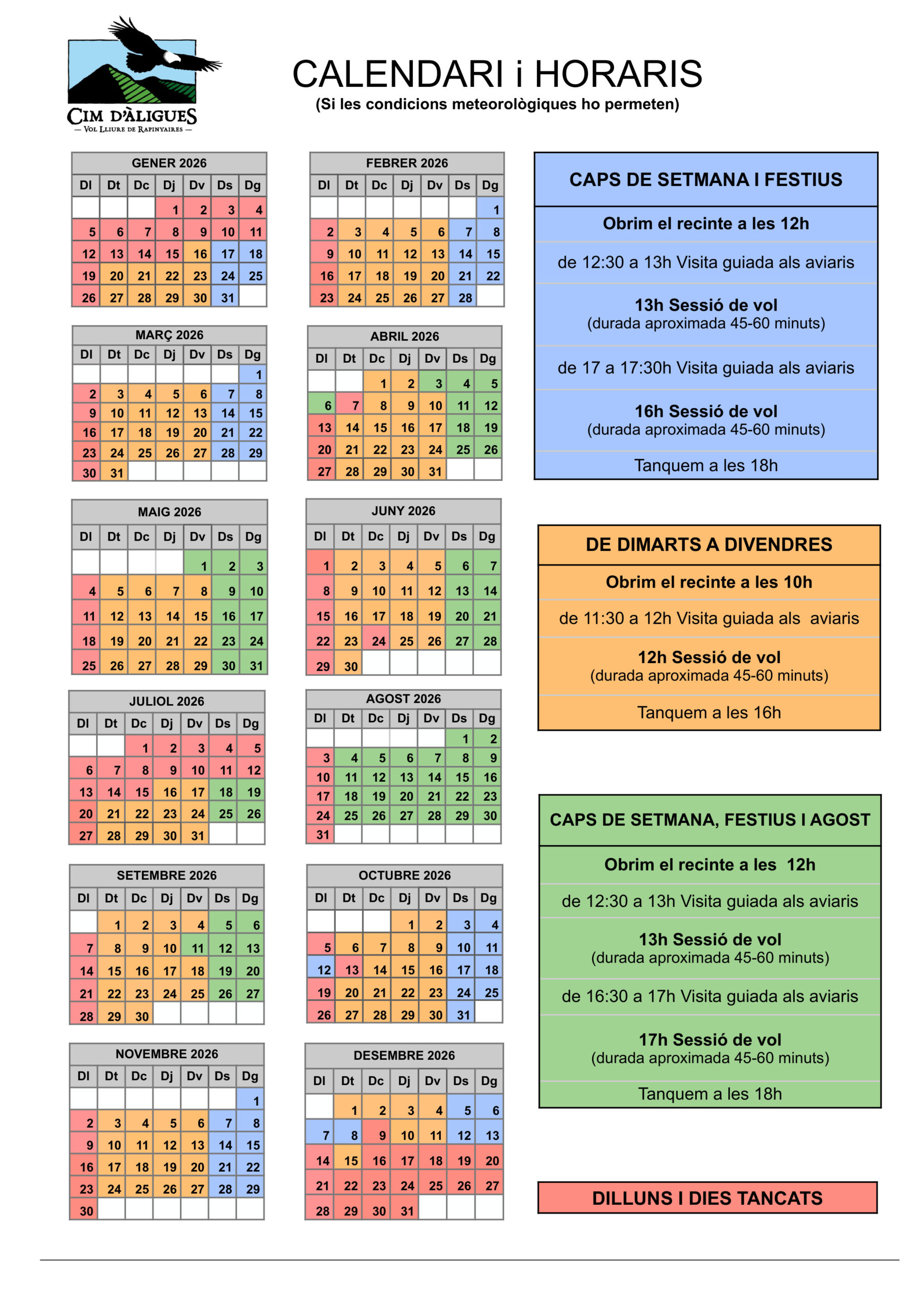 Totes les èpoques són bones per venir a visitar-nos; només cal tenir en compte que tot és a l’aire lliure, i que en cas de pluja, o vents intensos, la sessió de vol pot cancel·lar-se.